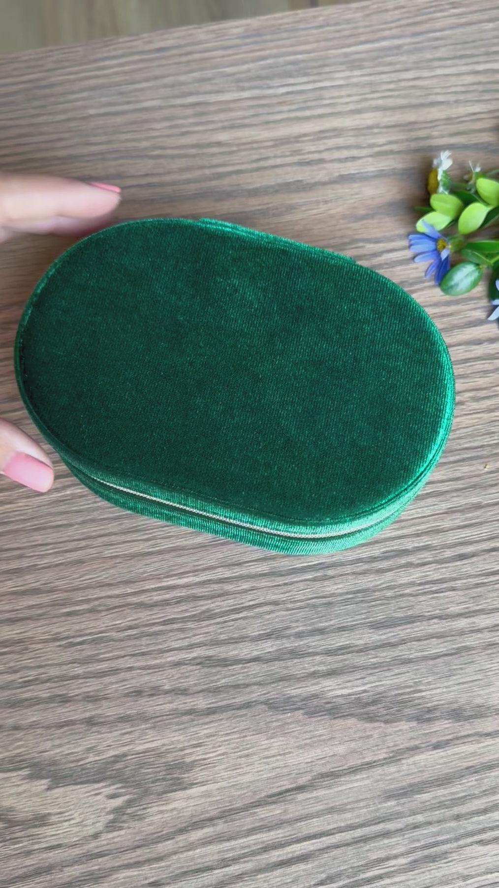 This compact and stylish jewellery box is suitable for storing your jewellery. It's a practical addition to your travel accessories, providing a secure and orderly space for your pieces. With dimensions of 15cm x 10cm x 4.5cm, this sophisticated box is made of green velvet fabric and has a zip closure. It also makes for an excellent present, especially when paired with a pair of earrings, a ring, or a necklace.